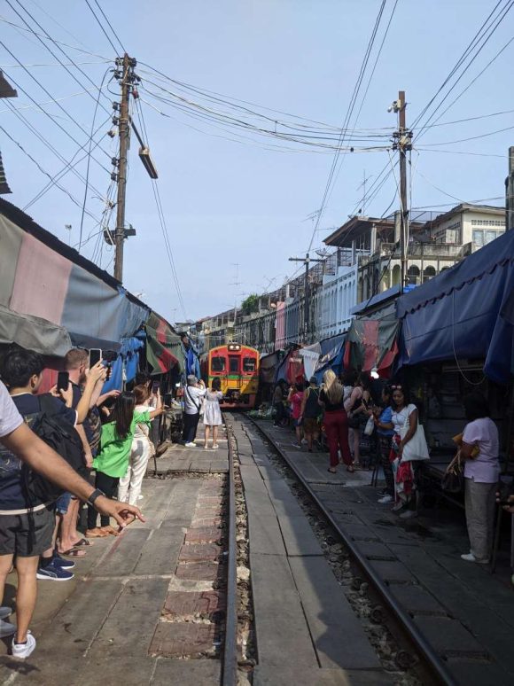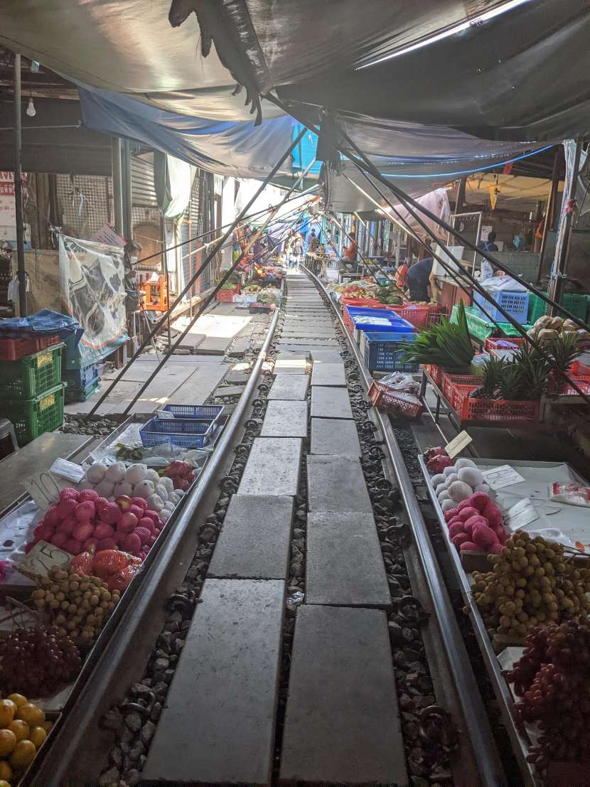 電車は、大体1時間から2時間おきに、市場を通ります。市場に電車が来ると、店の人が手際よく屋台のテントを畳みます。電車はすごくゆっくりで、電車の中から乗客が手を振ってくれました。電車が通り過ぎると、一瞬でまたテントを広げて、屋台が復活します。